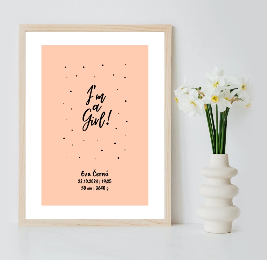 Náš plakát s nápisem JSEM HOLKA!, krásně zapadne jak do obývacího pokoje, ložnice, tak i do dětského pokojíku či kuchyně. Krásný dárek pro vaše blízké se jménem dítěte v barvě, kterou si vyberete sami. V jednoduchosti je krása. Lze přidat i jméno vašeho dítěte.